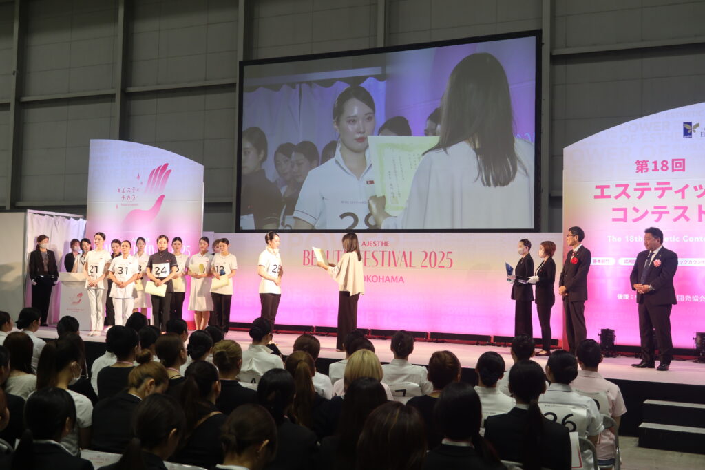 会場のステージでは、同協会のソシオエステティック(人道的・福祉的観点から、精神的・肉体的・社会的な困難を抱える人に対し、医療や福祉の知識を身につけて実施するエステティック)の資格を取得し、介護施設などで活動しているソシオエステティシャンによる、社会的意義および実践事例の発表が行われた。その後、コンテスト入賞者の発表と表彰式が執り行われた。