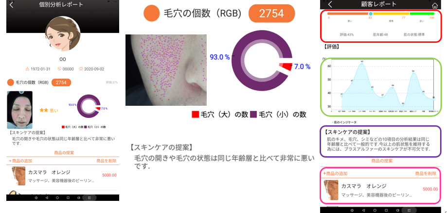 本機には、3000万人分の肌データが内蔵されている。これを基盤に、肌評価%、肌年齢、肌状態を即時解析し、結果に基づいた施術提案・商品提案を自動生成する。