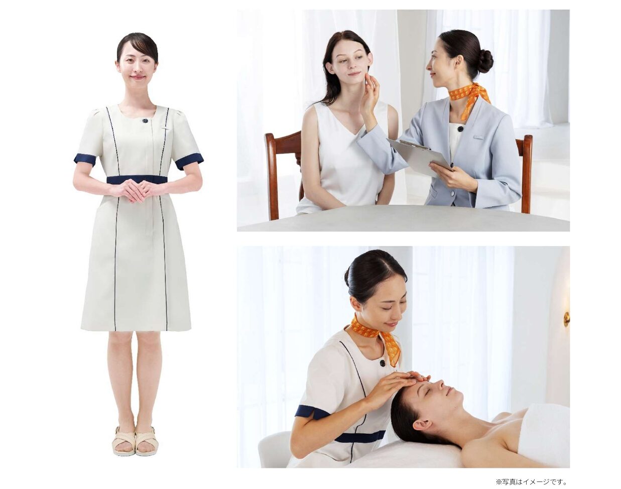今回の制服リニューアルでは、従来の制服が持つ清潔感はそのままに、洗練された美しいデザインと、エステティシャンのパフォーマンスを支える実用性を両立している。