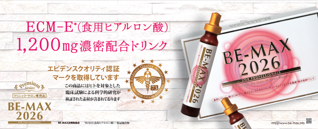 入浴後、就寝前には私が内科・アレルギー皮膚科のクリニックを銀座で運営していた時にアトピー性皮膚炎の患者様向けにサプリメントとして開発した、食用ヒアルロン酸配合の「BE-MAX 2026」をお口の中で潤していただくと、食用ヒアルロン酸ECMEのパワーで朝起きた時に肌の透明感と潤いがアップして整います。