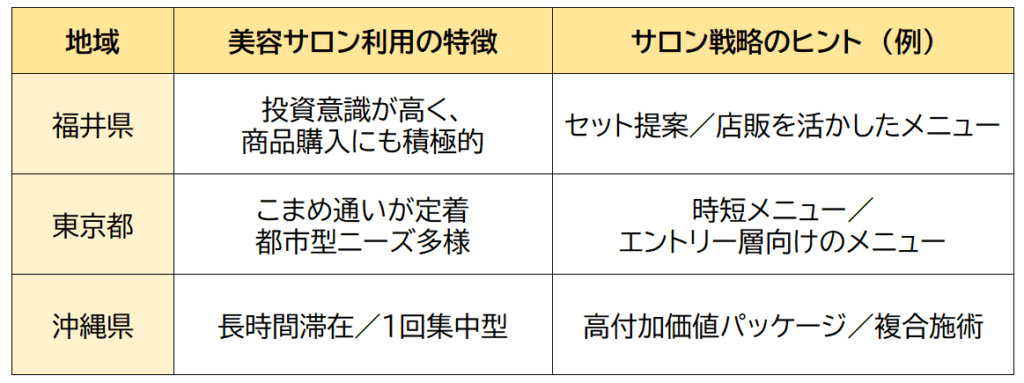 今回の調査結果からは、地域によって異なる「美容への向き合い方」が明確に見えてきました。今回の調査で取り上げたエリアの美容サロン利用の特徴と、サロン戦略のヒントをまとめてみましょう。