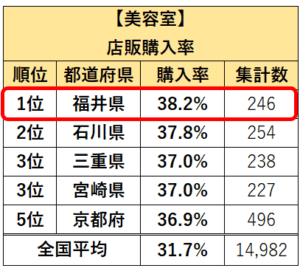 福井県では、施術だけでなくホームケアへの意識も非常に高いことがデータから読み取れます。美容室での店販購入率が38.2%で全国1位となっており、日々のケアにも積極的な姿勢が表れています。