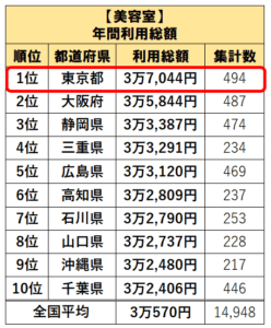 【美容室】1回あたりの利用金額ランキング(TOP10)