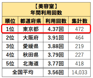 東京都は、美容室の年間利用総額(37,044円)と年間利用回数(4.37回)の両方で全国1位に。これは、カラーやトリートメントなどの“定期メンテナンス型”メニューが好まれていることも影響しています。