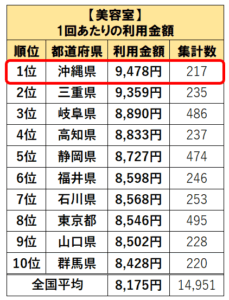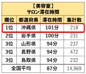 沖縄県では、美容室の1回あたりの利用金額が9,478円で全国1位、サロン滞在時間も101分と全国最長という結果が出ています。これは、複数メニューを1回で受ける“集中型”の利用が浸透していると考えられます。