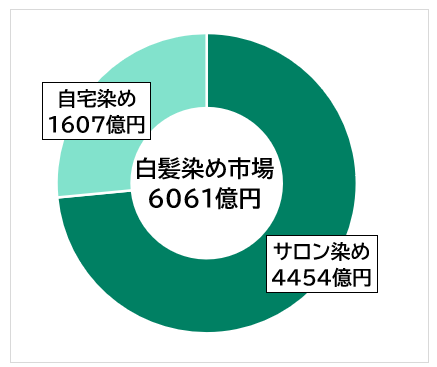 2025年時点での白髪染め市場は推計6061億円。このうちサロン染めが4454億円(全体の約7割)、自宅染めが1607億円と捉えています。