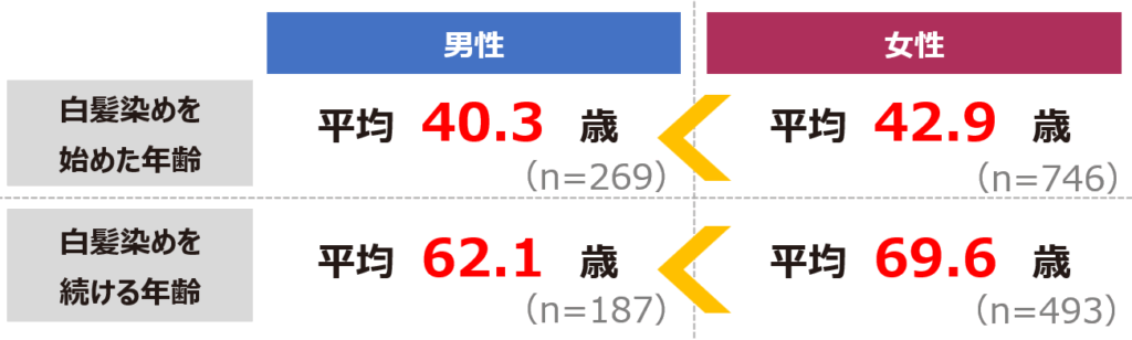さらに、白髪染めを始める平均年齢は男性40.3歳、女性42.9歳で、女性は約70歳まで続けるという継続性の高い習慣であることも明らかになっています。