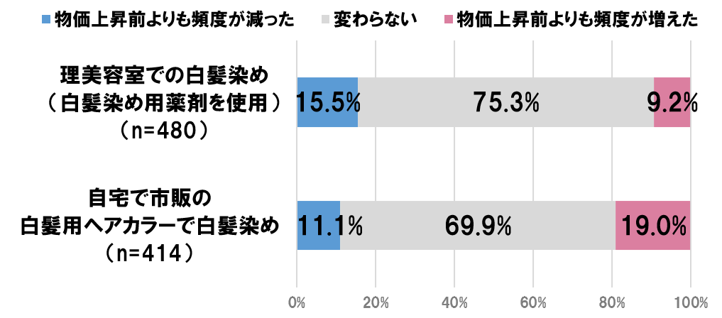 一方で、市販品を使った自宅染めは「増えた」19.0%が「減った」11.1%を上回り、コスト重視の動きが読み取れます。