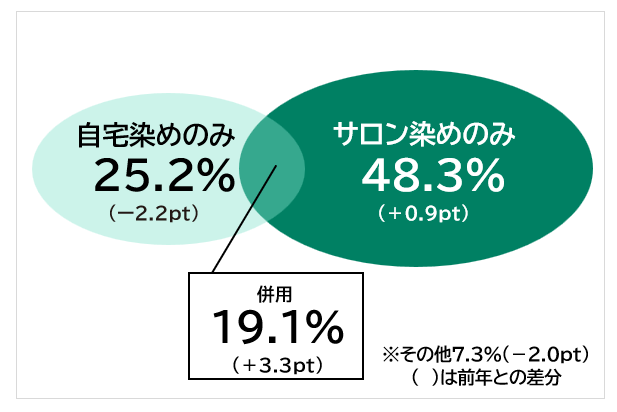 物価高の中で、自宅染めとサロン染めを使い分ける“併用派”も増加傾向にあります。調査によると、「サロンのみ」が48.3%、「自宅のみ」が25.2%、「併用」が19.1%です。前年と比べて併用層は+3.3ポイント増加しています。