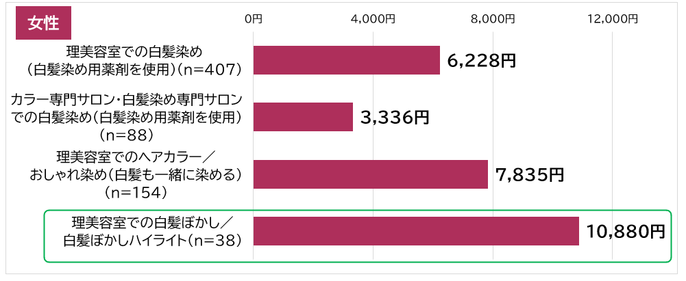 ハイライトを活用し、白髪を自然に見せるこの手法は、女性の1回あたりの平均単価が10,880円と高く、特別感のあるケアとして位置づけられています。