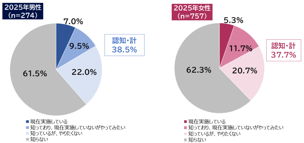 現在の実施率はまだ1割未満ですが、「知っていて、興味がある」層は男女ともに現状よりもシェアが高く、今後の広がりも期待できます。白髪ケアが「染める」から「魅せる」に進化しつつある動きは、サロンメニューの新しい方向性にもつながるかもしれません。