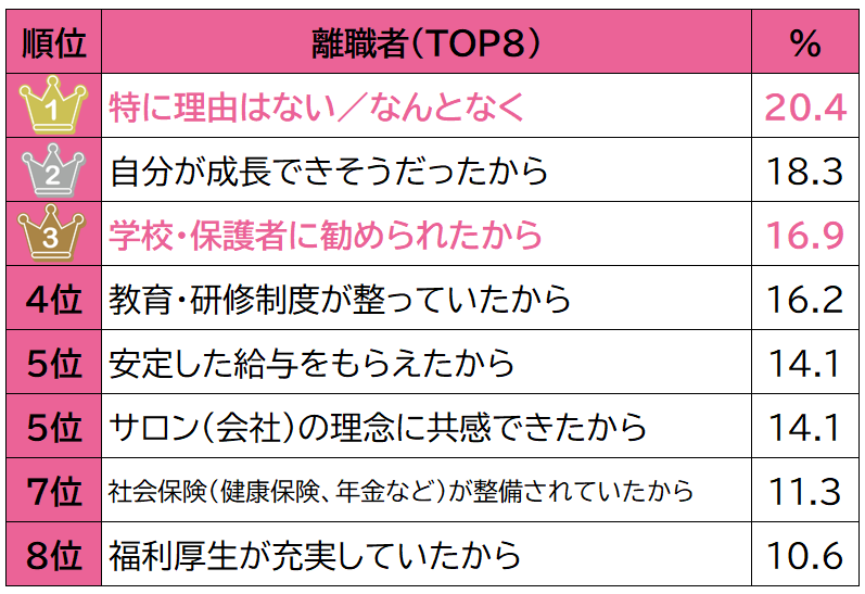 現在も美容業界で働いている人にサロンの入社理由を聞くと、「自分が成長できそうだったから」が1位に。上位には、「勤務日数・時間の融通がききやすかったから」「資格取得などのスキルアップの支援があったから」など、比較的はっきりした理由を持って入社している傾向がありました。