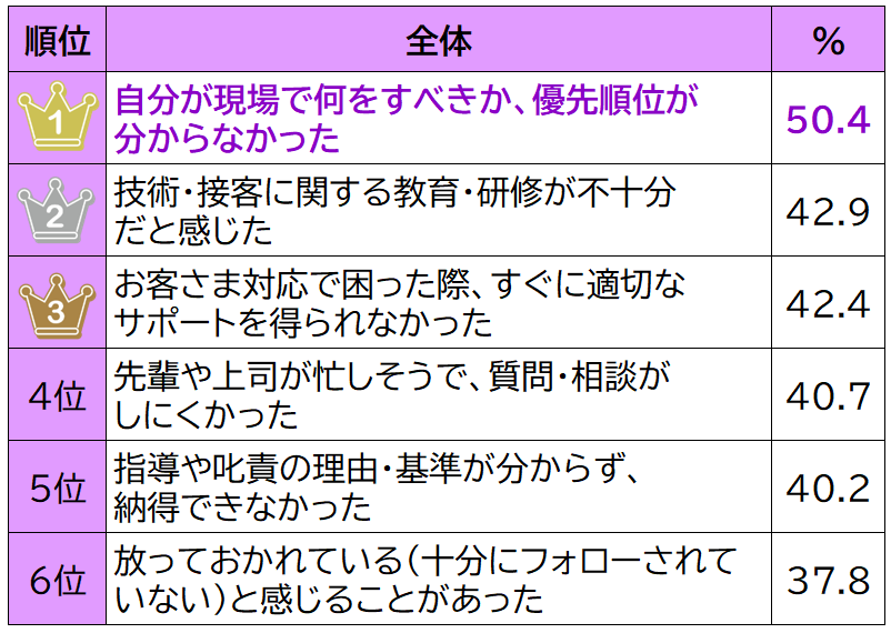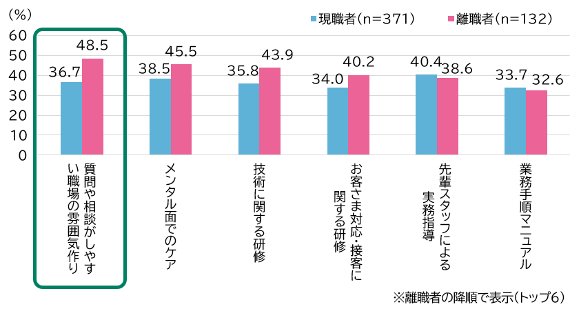 これは、技術や接客だけでなく、仕事の意味や価値が伝わっている職場ほど定着しやすいことを示唆しているでしょう。