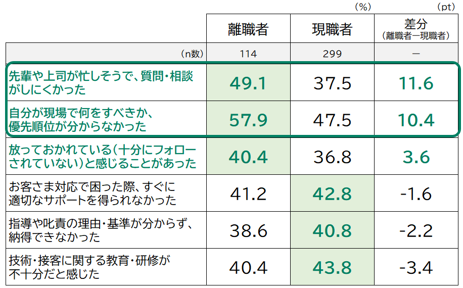 また「離職者」と「現職者」との差分が最も大きかったのは「先輩や上司が忙しそうで、質問・相談がしにくかった」が挙げられます。さらに「放っておかれている(十分にフォローされていない)と感じることがあった」についても、「離職者」のほうが「現職者」よりもスコアが上回っていました。