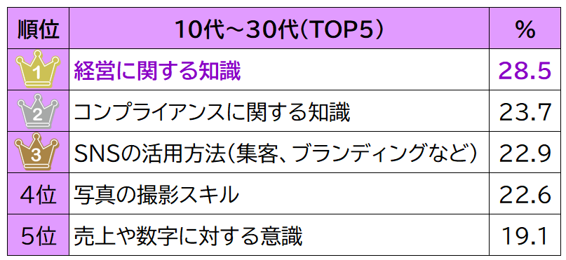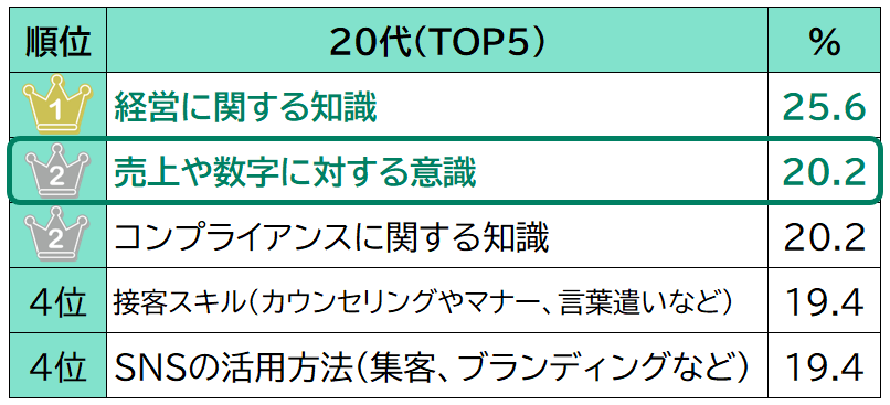 一方で、「もっと教わりたかった内容」として挙がったのが、「経営に関する知識」や、20代では「売上や数字に対する意識」です。つまり新人は、「どう動くか」だけでなく、「なぜこの仕事をするのか」「自分の役割がどこにつながっているのか」を知りたいと感じていることが読み取れます。